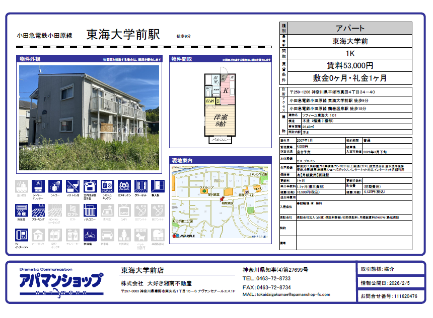 この物件は、大学まで徒歩8分、東海大学前駅までは18分になっています。ほかの物件にはあまりない追い炊き機能を完備した物件になっています。ほかにもあれば便利な浴室乾燥機能や独立洗面台もあります!インターネットも無料で使えるようになっています。
